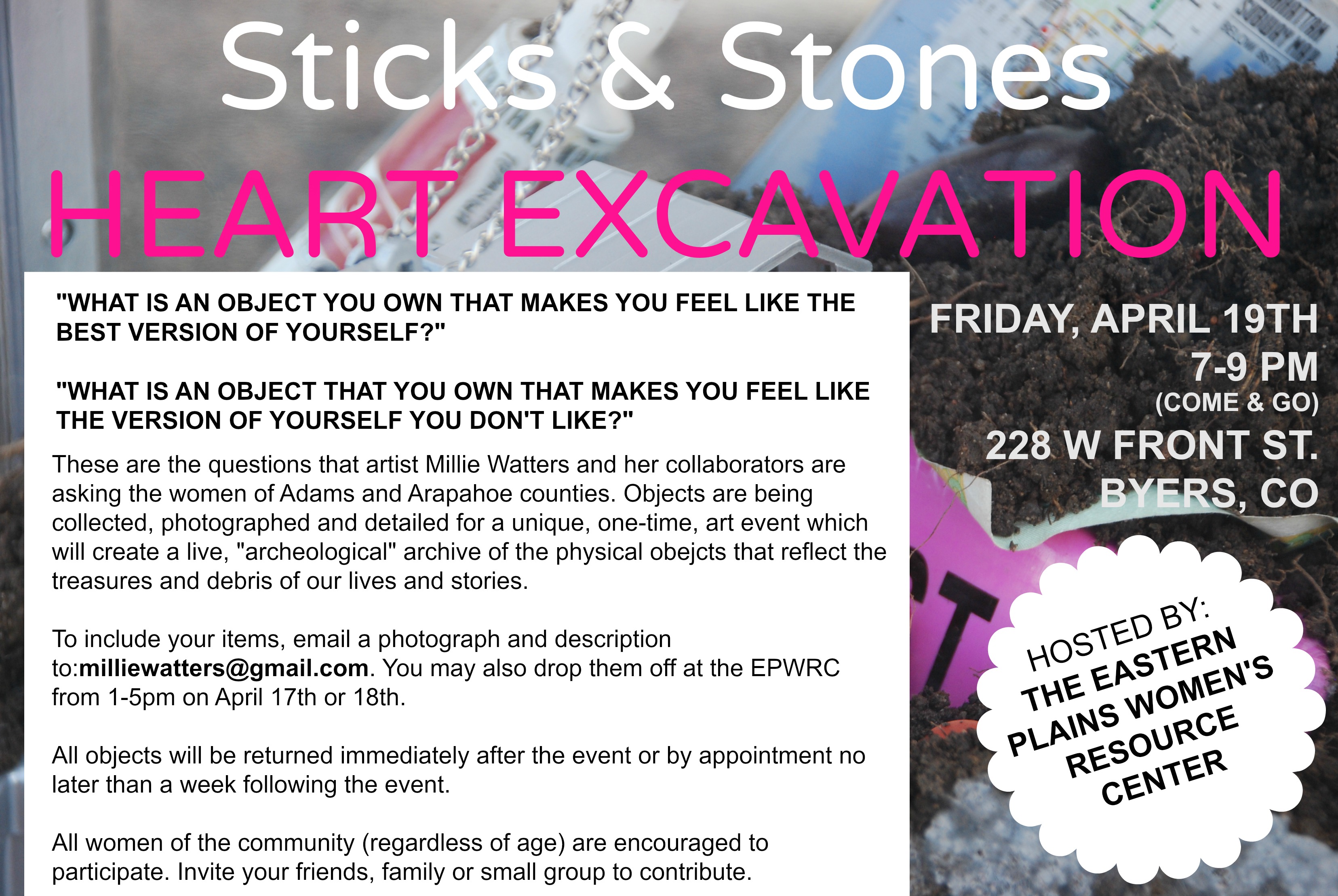 Social Practice Sticks & Stones: Heart Excavation This is the ad I placed in the I-70 Scout in Eastern Colorado. We attempted to conduct 50 door to door surveys and offered the questions up to the readership in local Adams and Arapahoe counties. Share this:Share Click to share on Facebook (Opens in new window) Facebook Click to email a link to a friend (Opens in new window) Email Click to print (Opens in new window) Print Like Loading... Related