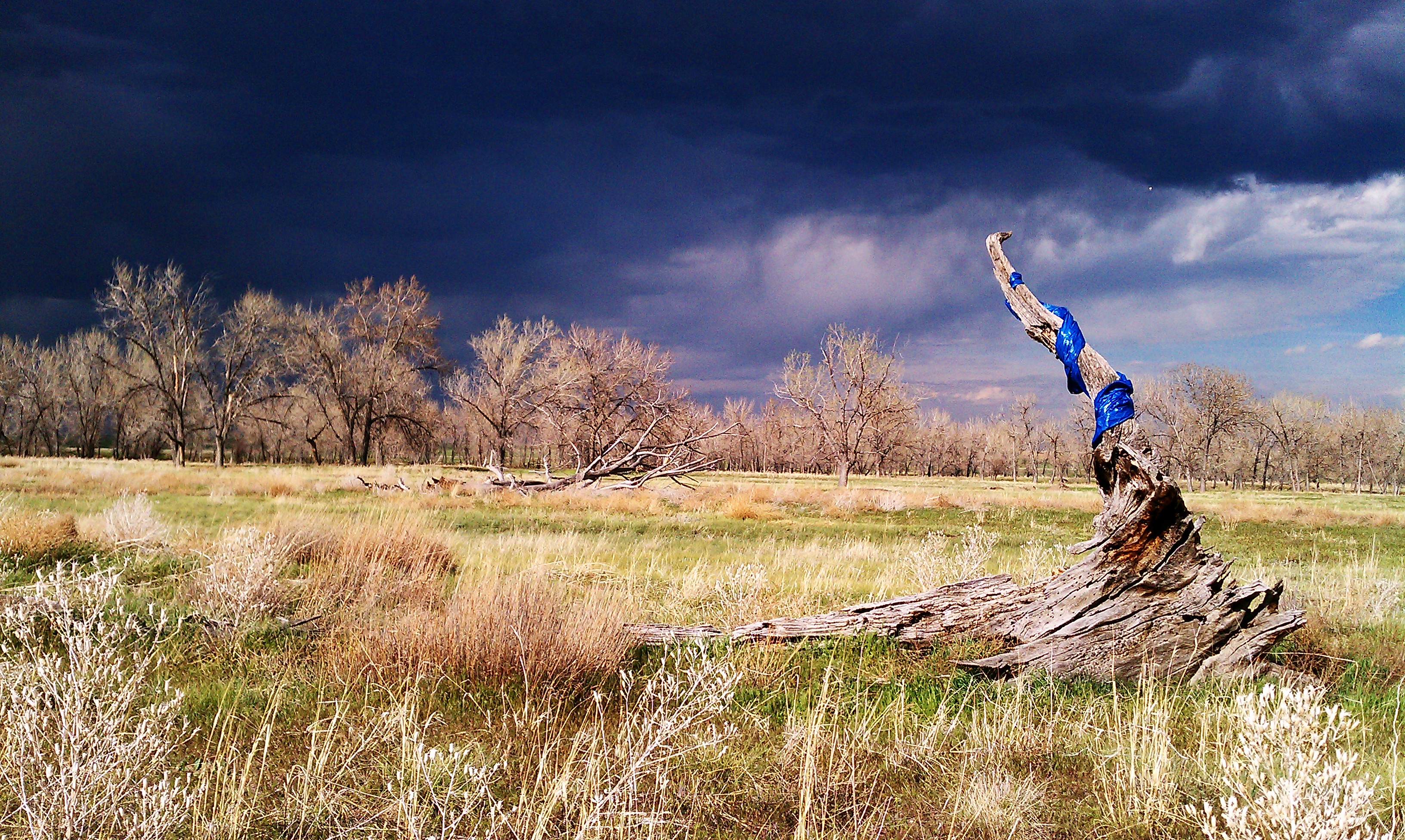 Serendipity, luck, grace, providence are all concepts that evoke the idea of a great “Other” at work. For “Triumph & Comfort”, I took a small collection of tools and materials to a large open space in Colorado with no premeditated work in mind. My process would be to engage the space within a short amount of time and respond to the environment. As I worked and experimented with various elements of the landscape, I was intrigued by the bare, dead wood in the middle of the field. While draping and dressing the tree with the tarp a spring storm began to move in quickly and overtake the work. The result was a surreal stake and claim for the sublime.