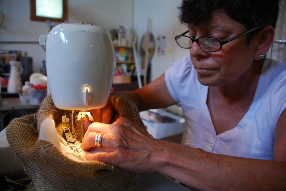 Dolores, an east Austin neighbor, helped sew labels onto burlap bags that would hold the contents of the Hope for Haiti mail outs. One of the Fireseed goals was to involve and empower the community to participate and contribute.